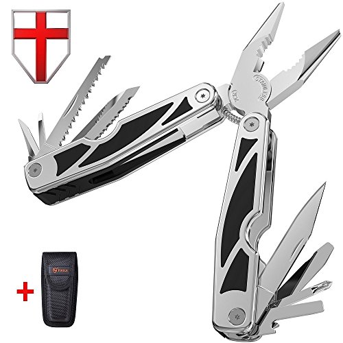 - 12 FEATURES IN ONE MULTITOOL - spring assisted loaded multi pliers, wire cutter and stripper, large size folding blade, big locking saw and serrator, philips and slotted screwdrivers, scraper blade, awl.